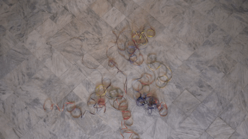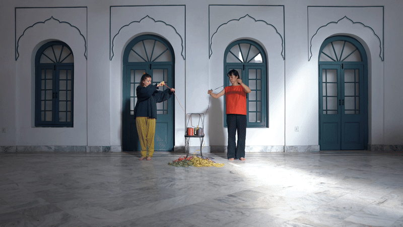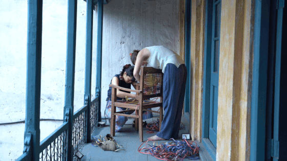 The editing of the film follows the weaving process. You see us talking, threading, guiding the string through gaps, tying knots, weaving, counting threads, making mistakes, undoing, and trimming. We move around the chair — standing, sitting, and constantly adjusting our positions as we adapt to the motion of the process. The pacing alternates between slow and fast, reflecting the rhythm of the manual labour of weaving . Meanwhile, the audio unfolds its own narrative, running parallel to the visual acts, creating a layered story within the film.